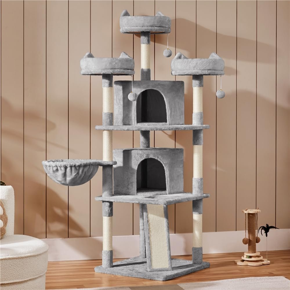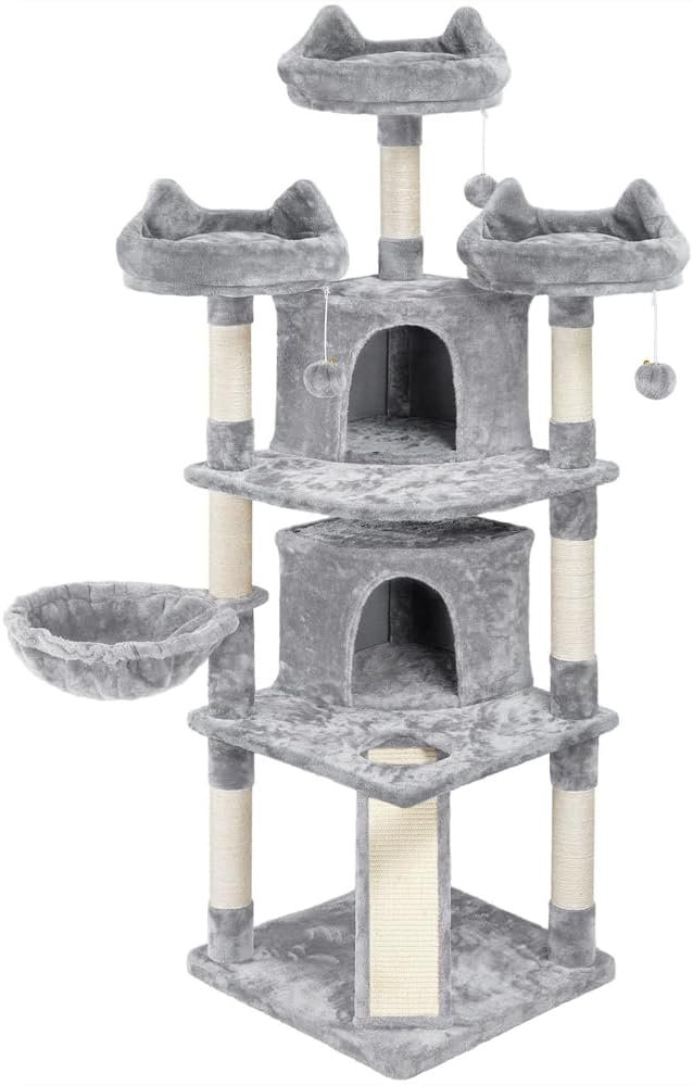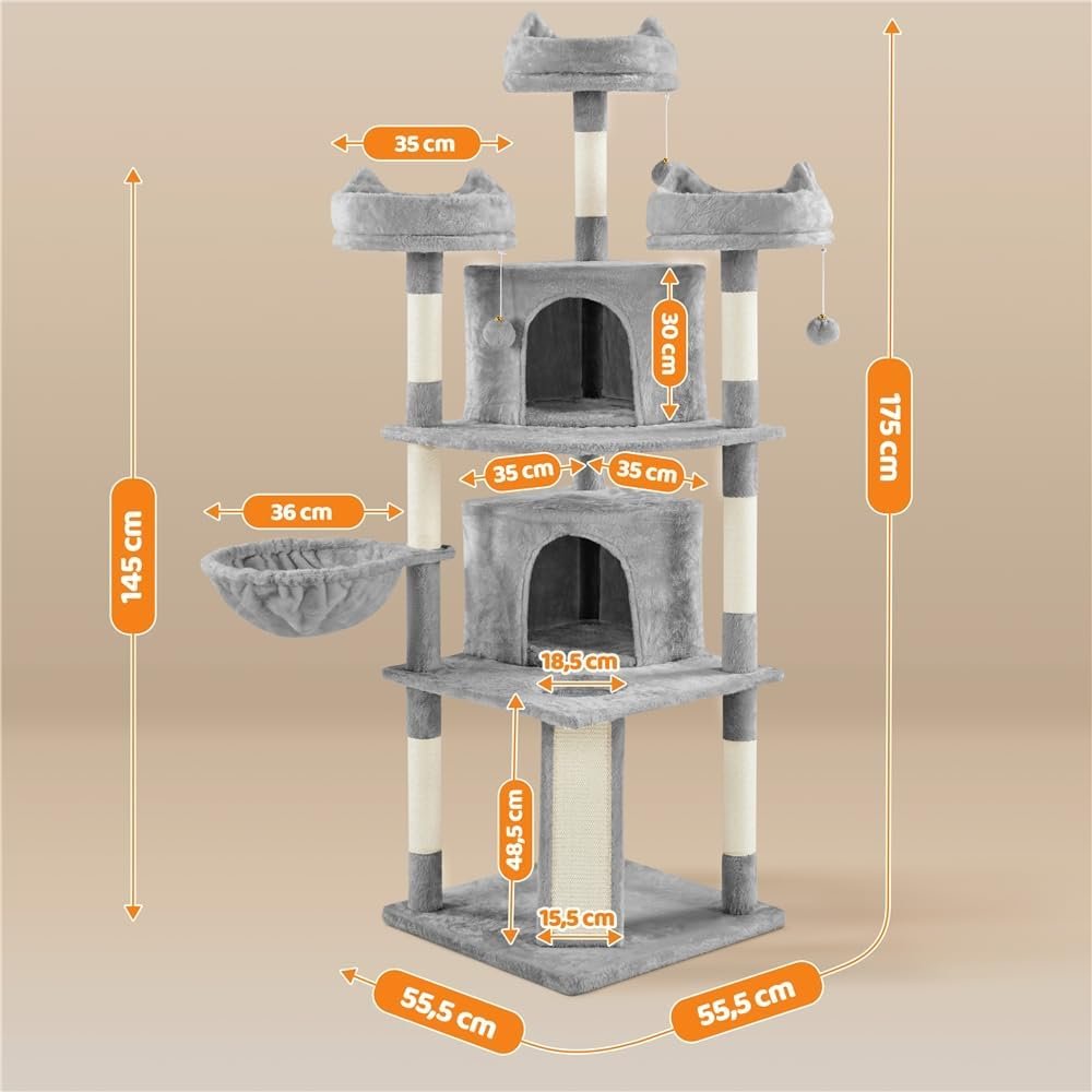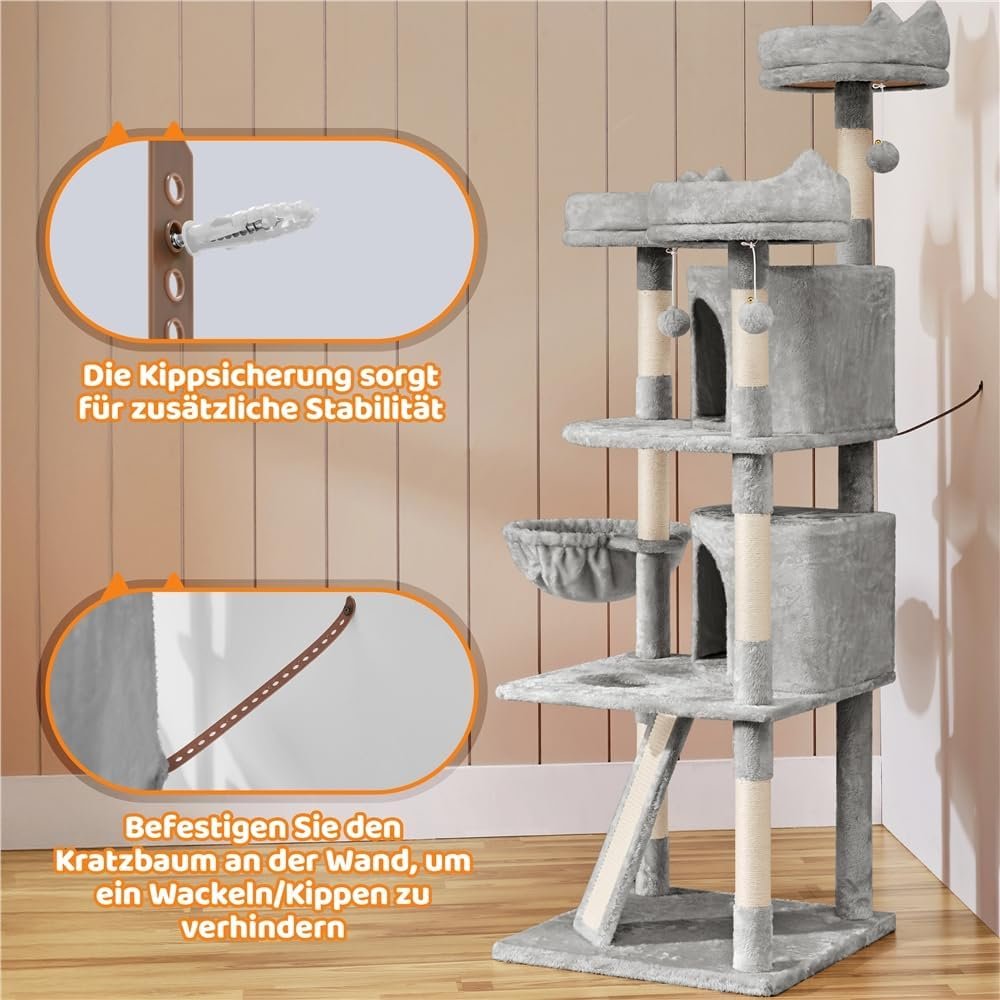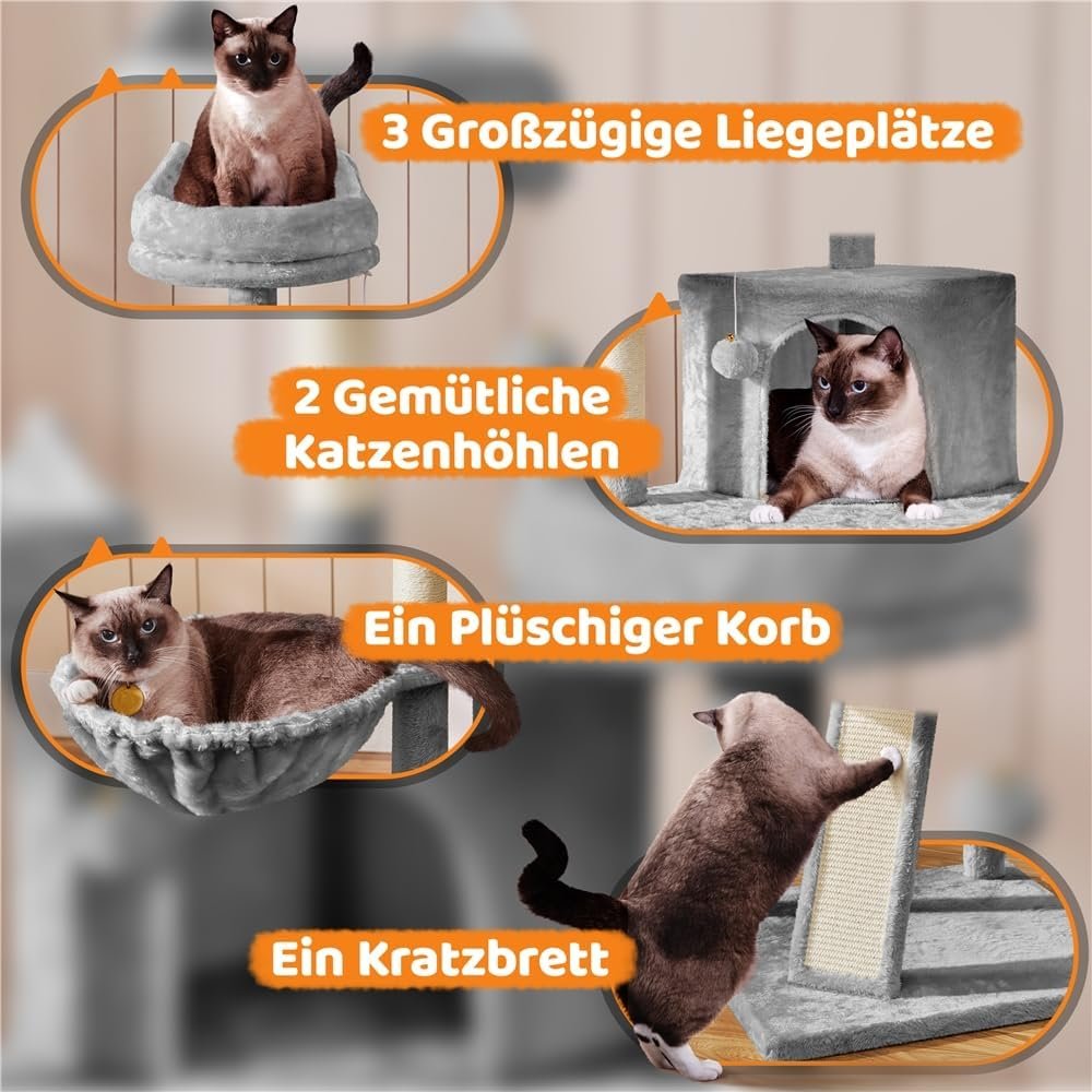Unser mehrstöckiger Kratzbaum besteht aus langlebigen und weichen Materialien, Spanplatten, Plüsch, Metall und Kunststoff. Es ist daher über einen langen Zeitraum einsetzbar. Wenn Sie mehr als eine Katze haben, ist dieser große Katzenturm die richtige Wahl. Es verfügt über mehrere Ebenen und bietet mehrere Unterteilungen und Funktionen, sodass Ihre Katzen nicht um ein Revier kämpfen müssen. Der Aufbau ist einfach und kann dank der mitgelieferten Anleitung problemlos durchgeführt werden.