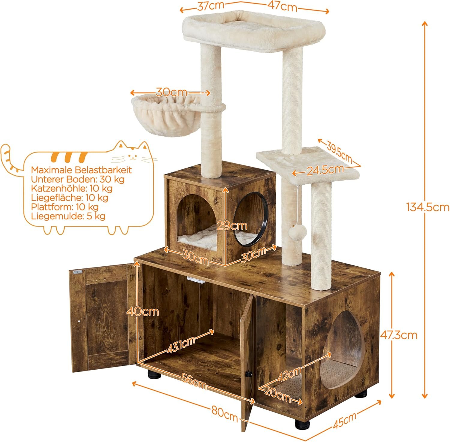 Robust und robust: Dieser Schrank besteht aus MDF-Holzplatten und der Kratzbaum besteht aus Spanplatten und weichem Plüschstoff. Die maximale Belastbarkeit der Plattform beträgt 10 kg und des Schranks 30 kg