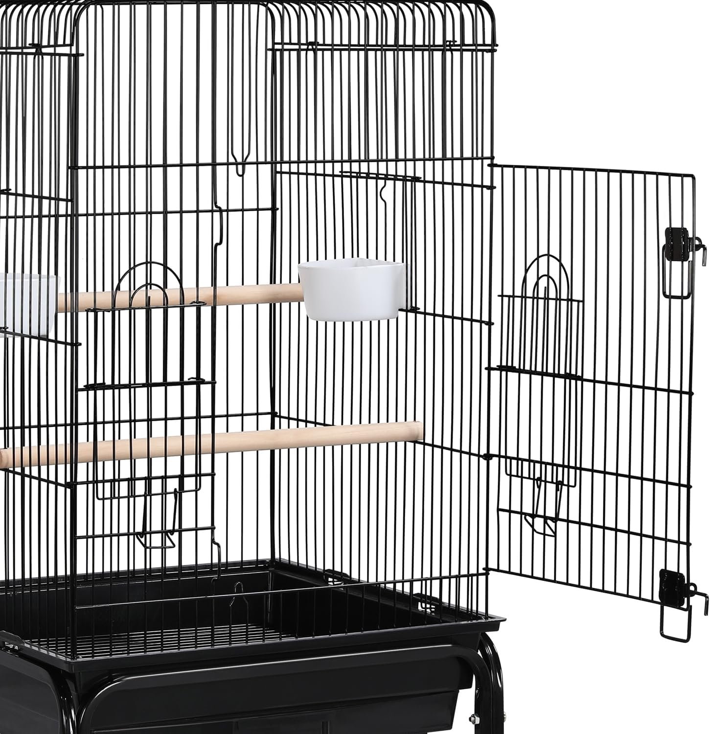 Praktisches Futtersystem: An der Innenseite dieses rollenden Vogelkäfigs können Sie zwei Futternäpfe anbringen, die durch die kleinen Futtertüren außerhalb des Käfigs zugänglich sind. Das praktische Design erleichtert nicht nur das Nachfüllen des Essens, sondern verhindert auch, dass Ihre leicht zu erschreckenden Freunde gestört werden