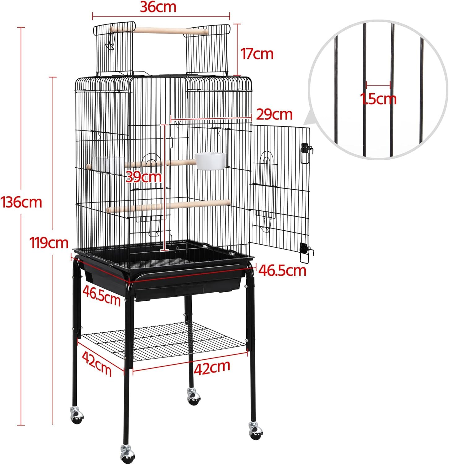 Korb an der Unterseite des Ständers: 44 x 31 x 6 cm, geeignet für Vogelfutter, Spielzeug und Reinigungsutensilien.