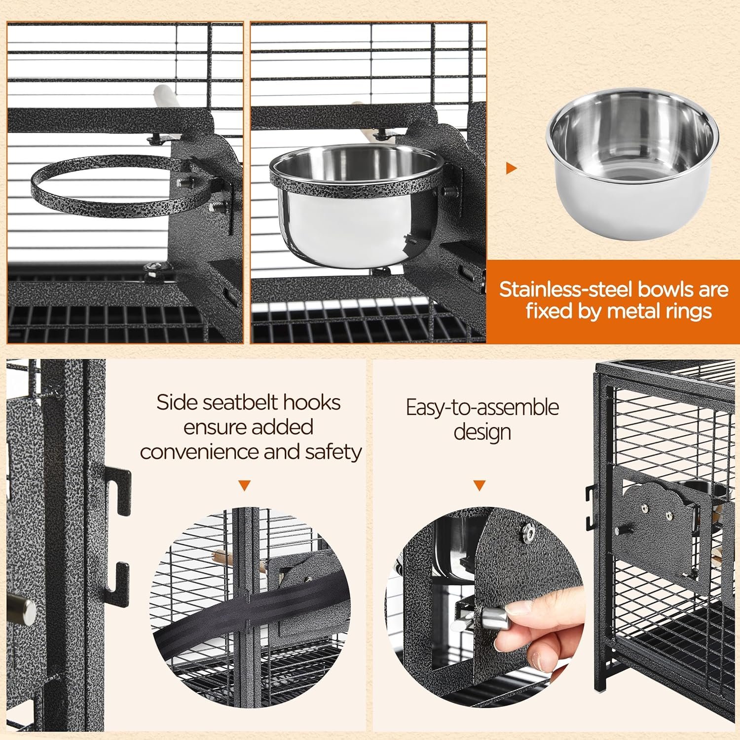 Praktische Details: Der Tragegriff an der Oberseite sorgt für einfaches Tragen. Die Höhe der Stange im Käfig kann an die Größe Ihres Vogels angepasst werden. Leicht zugängliche Futternäpfe ermöglichen ein einfaches Nachfüllen