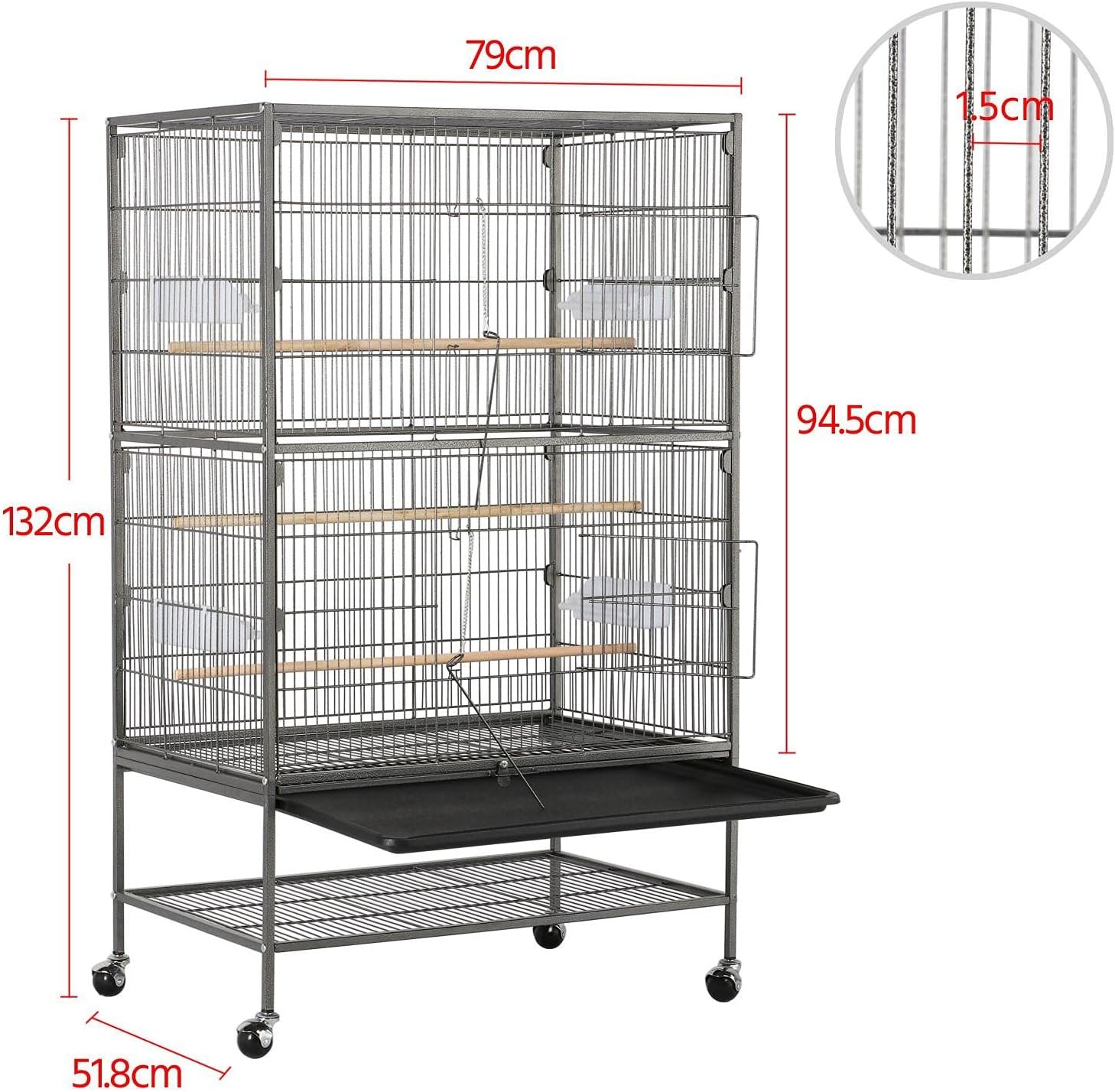 Der Käfig verfügt über ein ausziehbares Gitter für Vögel, die beim Reinigen des Käfigs aufstehen.