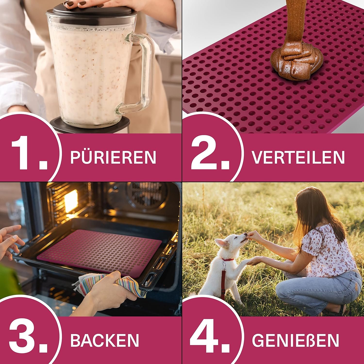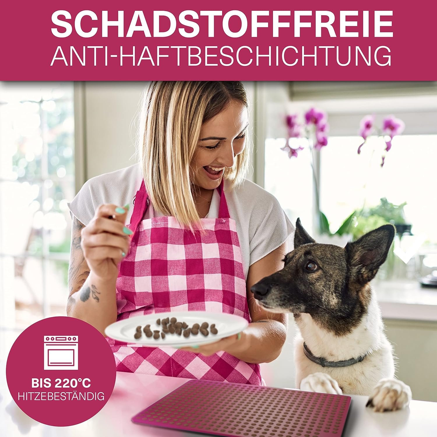 Leicht abwaschbar und hygienisch: Die Backmatte für Hundeleckerlis ist temperaturbeständig bis 220 °C, antihaftbeschichtet und perfekt für die Spülmaschine geeignet. Darüber hinaus ist unsere Backmatte für Hundeleckerlis mikrowellen- und ofenfest. Sicher und hygienisch!