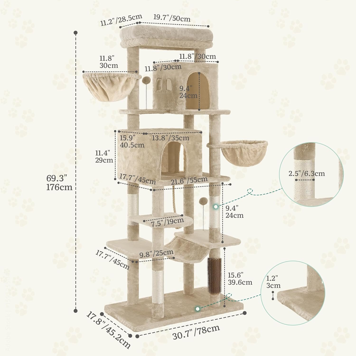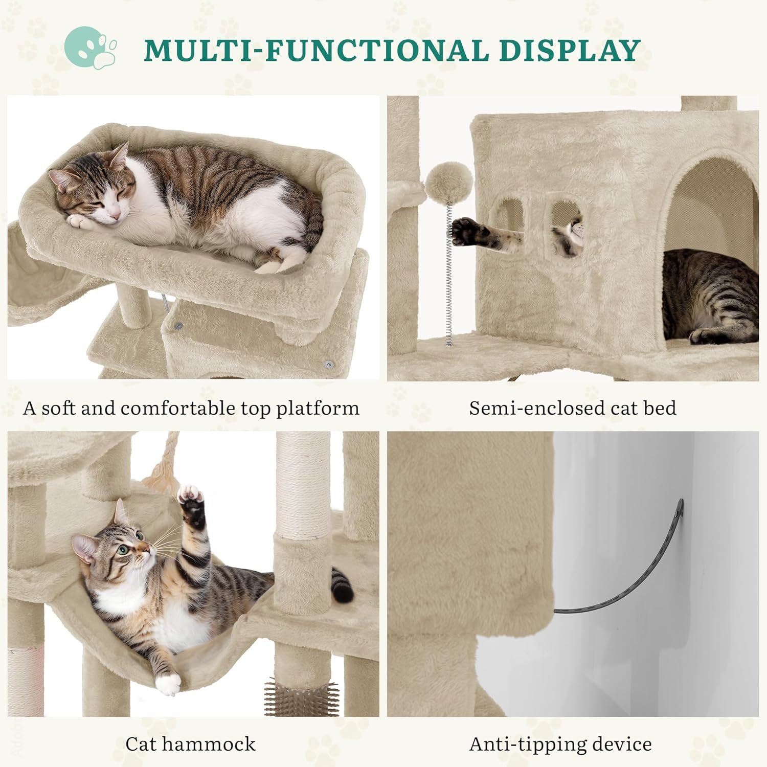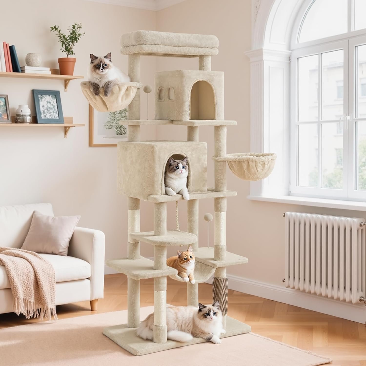 ALL-IN-ONE-SPIELPLATZ – 1 gut gepolsterte Plattform, 2 Kuschelhöhlen, 2 flauschige Körbe, 2 Plüschbälle und 1 Hängematte – auf diesem mehrstufigen Kratzbaum findet jede Katze ihren Lieblingsplatz