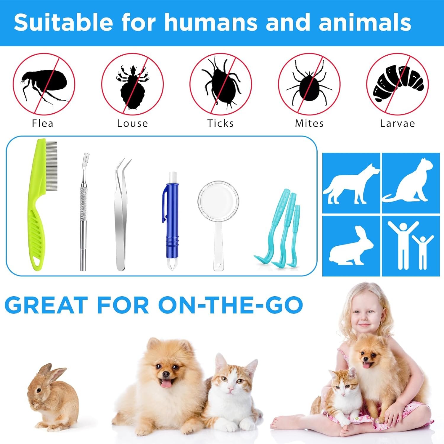 Breite Anwendung: Zeckenpinzette Human Set 8-in-1-Set, mit einer Vielzahl von Zeckenentfernungswerkzeugen, ideal zum Entfernen von Zecken, Flöhen, Läusen, Larven und anderen Schädlingen von Haustieren wie Hunden und Katzen sowie Menschen.