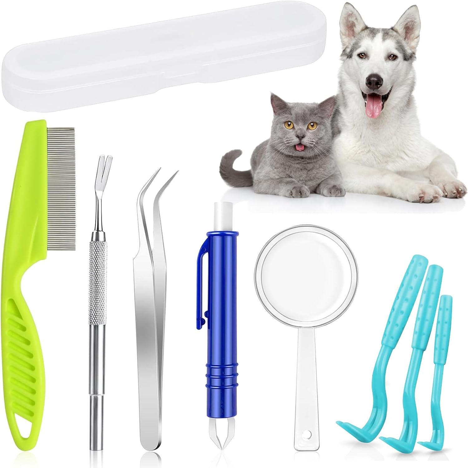 Lieferumfang: Unser Zeckenpinzetten-Set besteht aus 9 Teilen: 3 Läusepinzetten aus Kunststoff in verschiedenen Größen, 1 Läusepinzette mit Feder, 2 Doppelpinzetten, 1 Lupe, 1 dichter Kamm, 1 Kunststoffbox. Zecken lassen sich leicht von Haustieren entfernen.