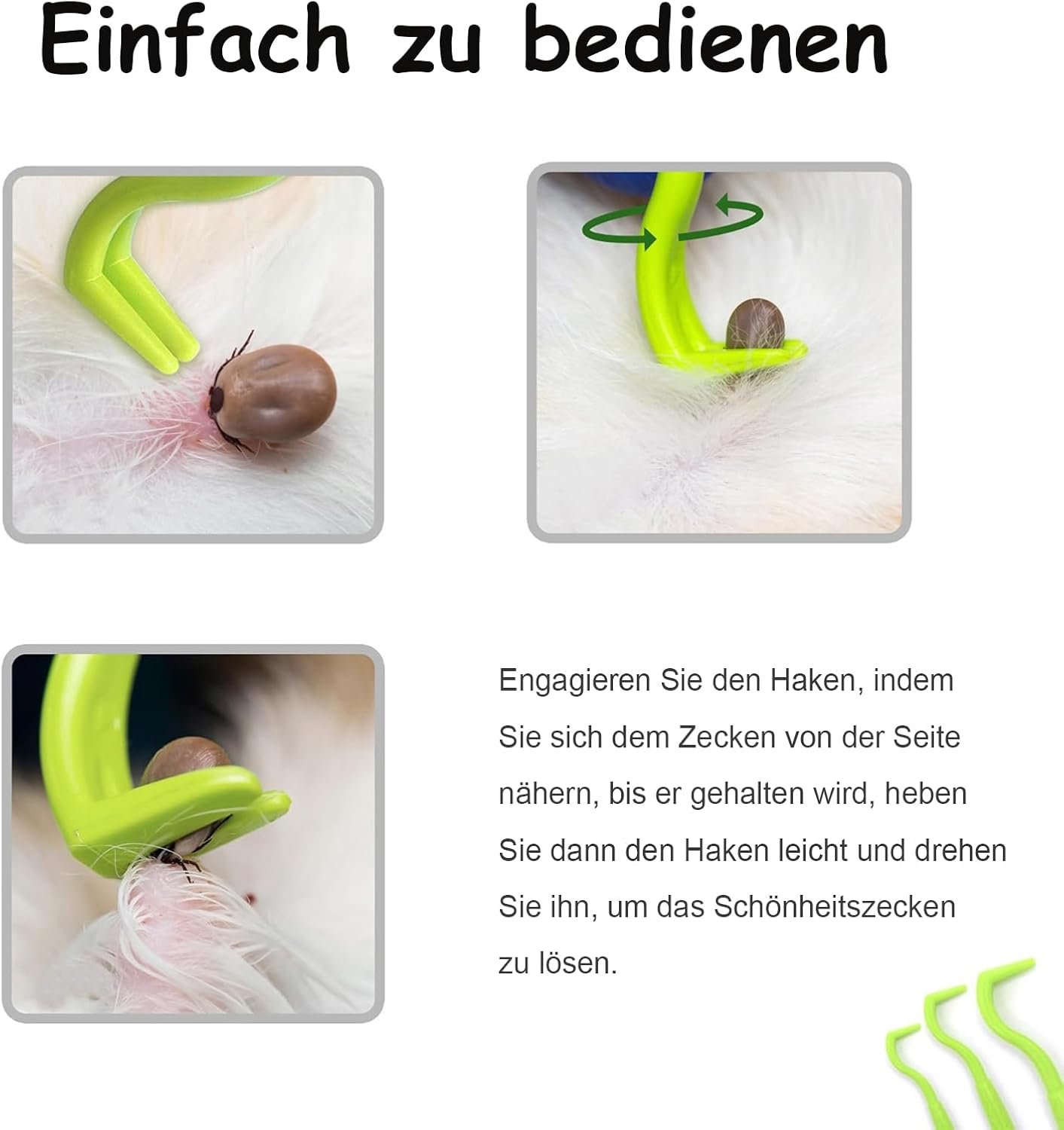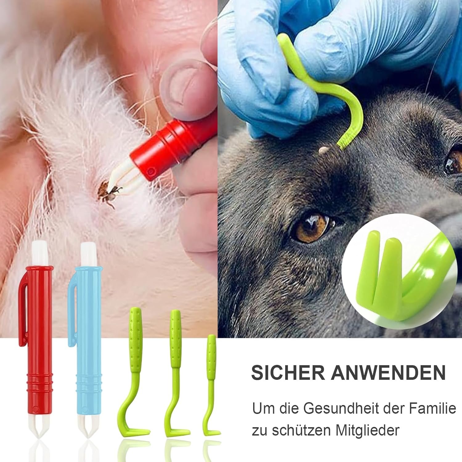 Unser Zeckenhaken-Set eignet sich für alle Tierarten und Menschen. Die präzise Anwendung ermöglicht eine sichere Zeckenentfernung ohne Risiken.