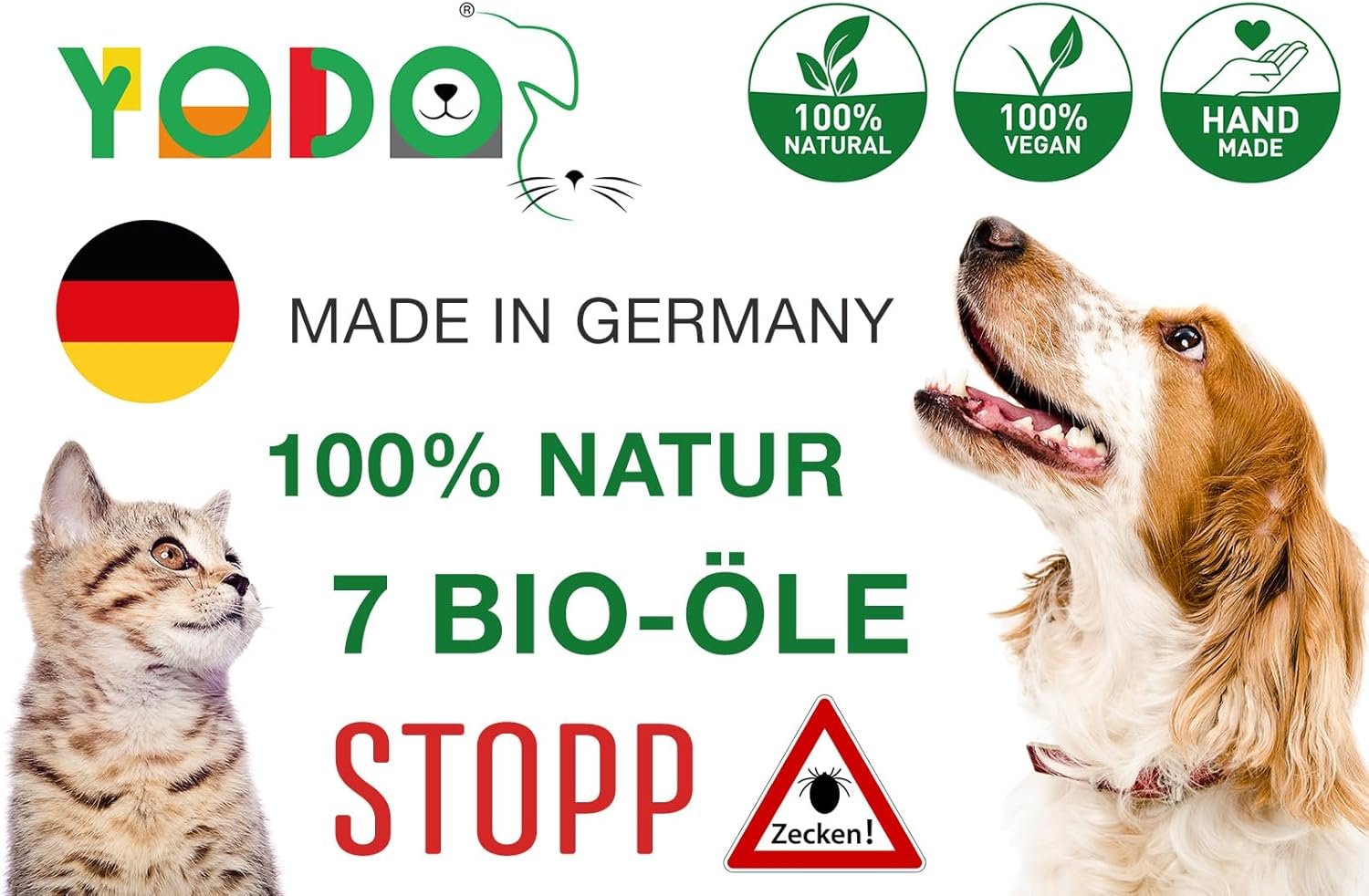 YODO Zeckenschutz – natürliches Premium-Zeckenöl. Schützen Sie Ihr Haustier auf natürliche Weise vor Zecken und anderen Parasiten mit YODO’S Zeckenschutz, dem Premium-Zeckenöl aus 100 % Bio-Zutaten. Unsere einzigartige Mischung aus sieben hochwertigen Bio-Ölen bietet eine wirksame und umweltfreundliche Alternative zu chemischen Zeckenmitteln – ohne Einbußen bei der Wirksamkeit. 100 % natürliche Inhaltsstoffe zum Schutz Ihres Hundes. Wir lieben die Natur und unsere Tiere, deshalb verwenden wir nur die besten Zutaten. Einzelne Öle beeindrucken Parasiten wie Zecken, Flöhe und Mücken kaum, entscheidend ist das Zusammenspiel verschiedener Öle. YODO’S Zeckenschutz enthält eine leistungsstarke Kombination aus sieben Bio-Ölen und ätherischen Bio-Ölen, die Zecken und andere Parasiten gezielt fernhalten. Die sorgfältige Auswahl dieser hochwertigen natürlichen Inhaltsstoffe sorgt nicht nur für bestmöglichen Schutz, sondern schont auch Fell und Haut Ihres Tieres. Die Kombination aus sieben kraftvollen Bio-Ölen bietet eine natürliche Barriere gegen Zecken und andere Parasiten. Die enthaltenen Öle sind: vier Bio-Öle mit parasitenabweisenden und pflegenden Eigenschaften. Bio-Kokosöl – pflegt die Haut und hat gleichzeitig eine abschreckende Wirkung auf Zecken. BIO-JOJOBAÖL – Unterstützt die Gesundheit der Haut und bietet zusätzlichen Schutz. Bio-Neemöl – ein bewährtes Naturheilmittel zur Bekämpfung von Insekten und Parasiten. Bio-Schwarzkümmelöl – Beruhigt die Haut, wirkt antibakteriell und entzündungshemmend. Drei ätherische Bio-Öle: Bio-Zitronengrasöl – sorgt für einen angenehmen, natürlichen Duft und schützt vor Insekten. Bio-Lavendelöl – wirkt beruhigend auf die Haut und wirkt zusätzlich zeckenabweisend. Bio-Zedernholzöl – ein kraftvolles ätherisches Öl zur Bekämpfung von Parasiten. Einfache Anwendung mit Glaspipette – Dank der praktischen Glaspipette lässt sich das Zeckenöl einfach dosieren und gleichmäßig auf die Haut Ihres Haustieres auftragen. Tragen Sie einfach alle 5 cm 1-2 Tropfen vom Kopf bis zum Stabansatz auf und massieren Sie das Öl sanft ein. Je nach Größe Ihres Tieres können Sie auch mehrere Tropfen in Ihren Händen verreiben und gleichmäßig im Fell verteilen. Der wirksame Zeckenschutz entsteht durch die Synergie von Bio-Ölen. Von Hundebesitzern getestet und bewährt. Wir haben YODO’s Zeckenschutz über ein Jahr lang getestet, um die perfekte Mischung zu entwickeln. Nach zahlreichen Versuchen und Anpassungen können wir mit Stolz sagen, dass diese Formel die beste Wirkung gegen Zecken bietet. Viele Hundebesitzer und ihre Tiere haben diese Formel erfolgreich ausprobiert – das Ergebnis ist ein zuverlässiges Zeckenöl, das Sie mit gutem Gewissen verwenden können. Vertrauen Sie auf den Zeckenschutz von YODO – den natürlichen Schutz für Ihr Haustier. Unsere Ölmischung ist frei von synthetischen Chemikalien und stellt die Gesundheit Ihres Haustieres und der Umwelt in den Mittelpunkt. Holen Sie sich jetzt das natürliche Zeckenöl, das Ihr Haustier verdient! Auch wenn der Zeckenschutz von Yodo eine hervorragende natürliche Unterstützung im Kampf gegen Zecken bietet und wir in unseren Tests einen beeindruckenden Rückgang des Befalls verzeichnen konnten, kann kein Mittel gegen Zecken einen hundertprozentigen Schutz garantieren. Um das Risiko eines Zeckenbefalls weiter zu minimieren, empfehlen wir, Ihr Haustier nach jedem Spaziergang gründlich auf Zecken zu untersuchen.