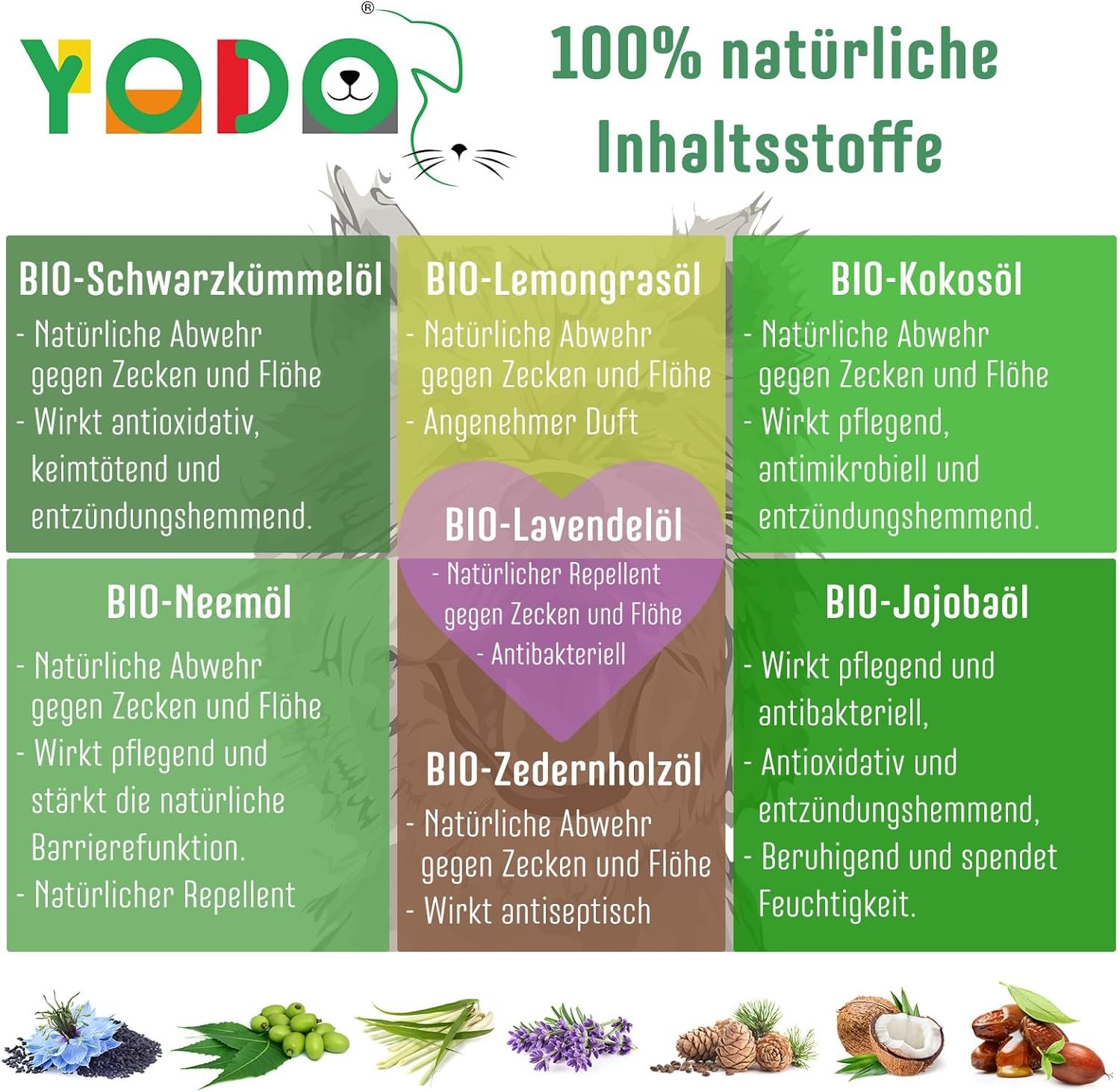 100 % NATÜRLICHE ZUTATEN: YODO’S Zeckenschutz enthält eine kraftvolle Mischung aus 7 hochwertigen Bio-Ölen und ätherischen Bio-Ölen, darunter Kokosnussöl, Jojobaöl, Neemöl, Schwarzkümmelöl, Zitronengrasöl, Lavendelöl und Zedernholzöl – perfekt abgestimmt, um Zecken und andere Parasiten auf natürliche Weise fernzuhalten. Lieferumfang: 750 Tropfen / 30 ml Pipettenflasche