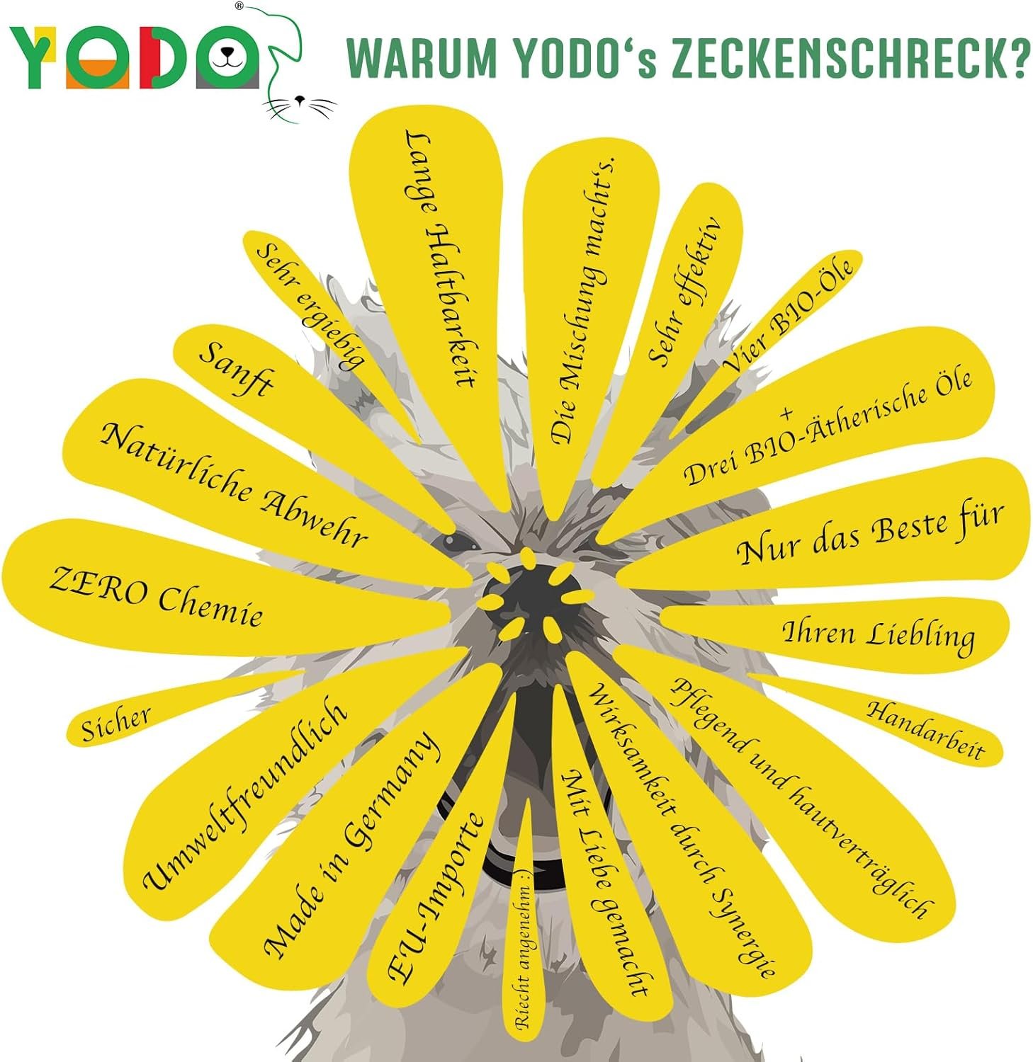 Für Tier und Natur – ohne Kompromisse: Wir setzen auf Nachhaltigkeit und Verantwortung! YODO’S Zeckenschutz ist frei von synthetischen Chemikalien, Parabenen oder künstlichen Duftstoffen – sicher für Ihr Haustier und umweltfreundlich.