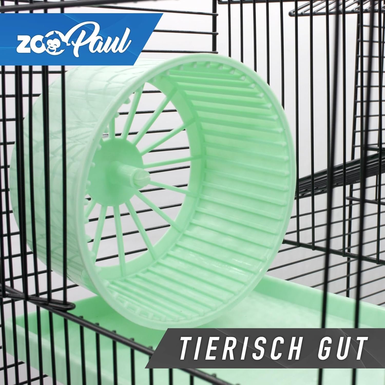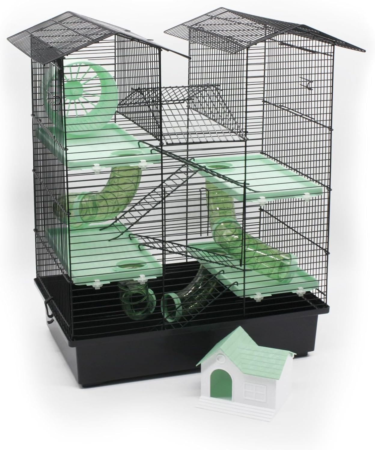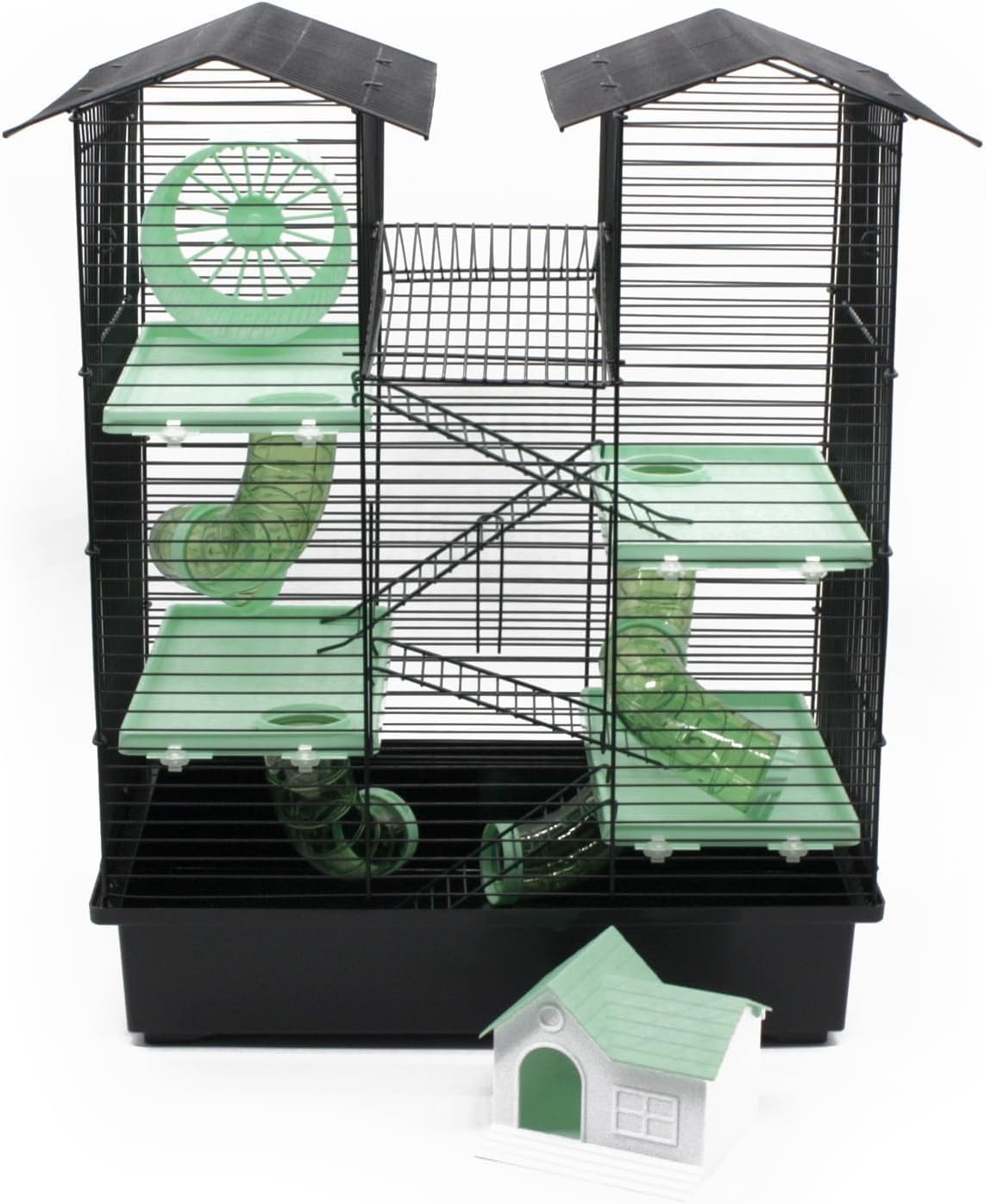 Der Käfig wird mit tollem Zubehör geliefert. Etwa ein Laufrad und ein Häuschen, dazu vier Ebenen und Montagematerial.
