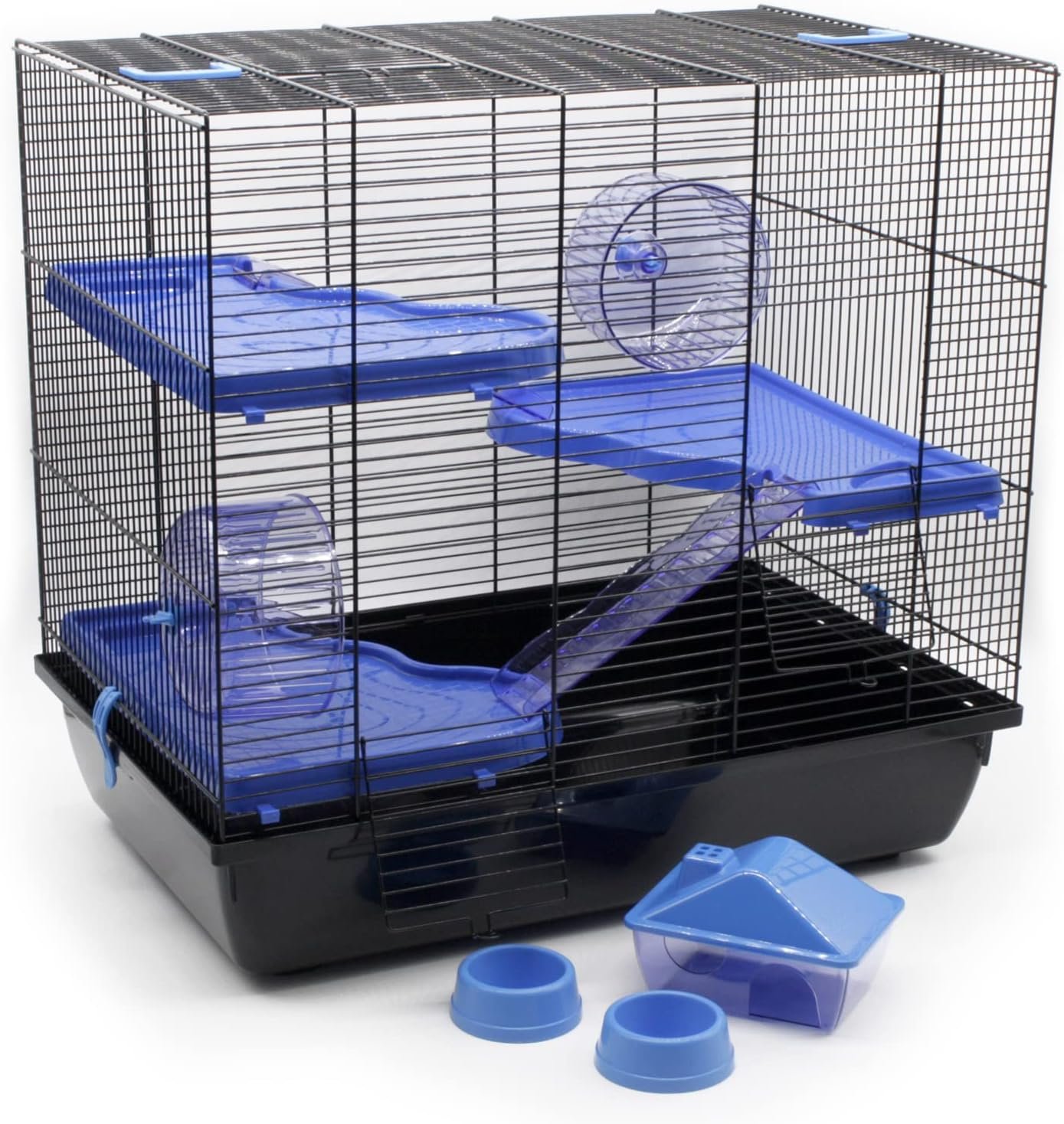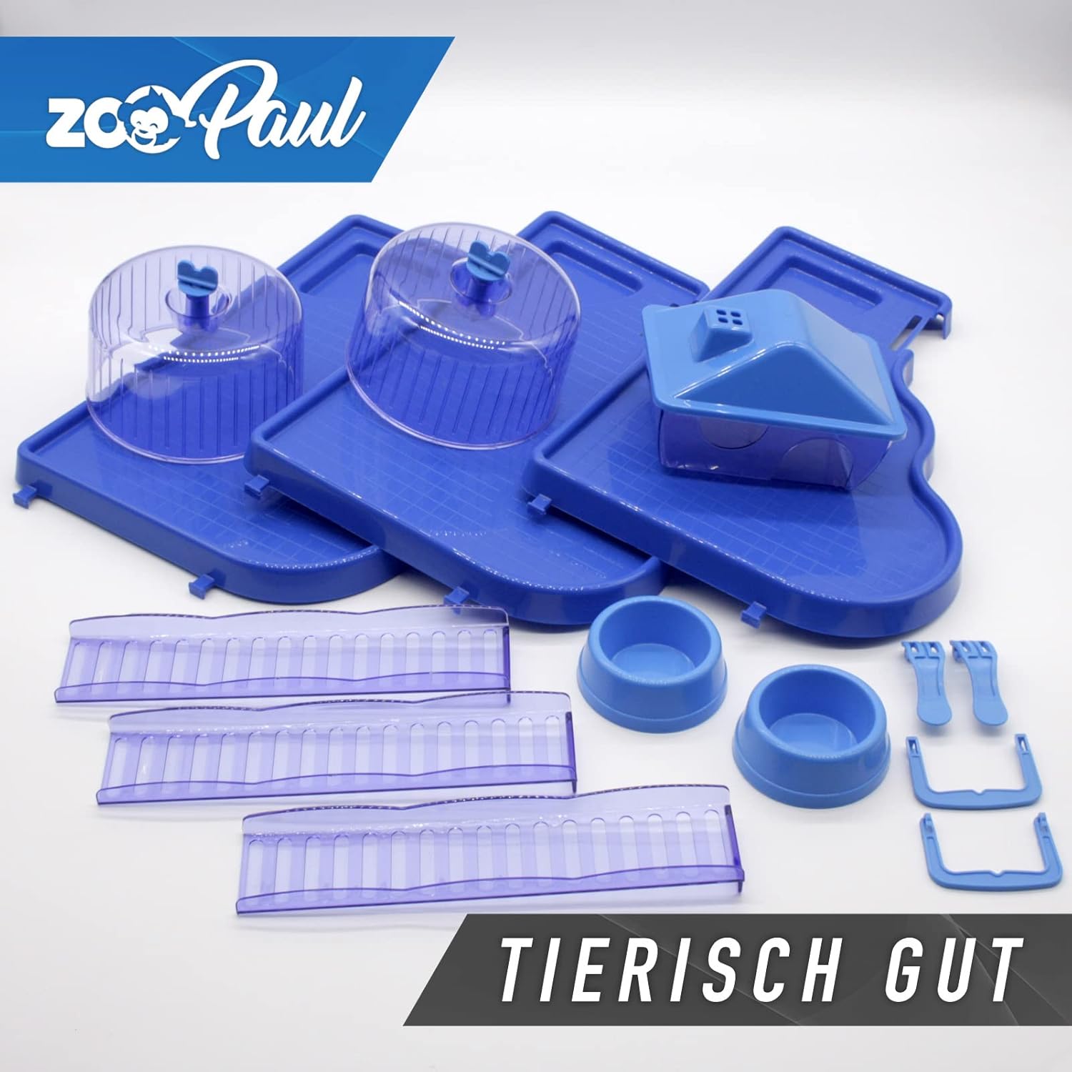 Der Käfig wird mit einem großen Zubehörpaket wie 1 Haus, 2 Rädern, 2 Futternäpfen usw. geliefert. Außerdem sind 3 Regale und 3 Kunststoffleitern enthalten.