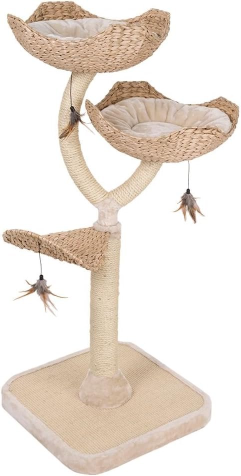 Der Katzenblumen-Kratzbaum ist ein wahrer Traum für Ihren Stubentiger und ein besonderes Highlight in Ihrem Zuhause. Sein einzigartiges blütenförmiges Design verleiht ihm nicht nur ein ästhetisches Aussehen, sondern auch außergewöhnliche Stabilität. Dafür sorgt der unsichtbare, mit Sisal umwickelte Metallstamm, der für eine robuste Struktur sorgt. Die dicke Bodenplatte mit natürlicher Sisal-Kratzmatte bietet ausreichend Kratzfläche für die nötige Krallenpflege Ihres Haustiers. Die hochwertigen Naturmaterialien, wie Blätter der Wasserhyazinthe und Natursisal, verleihen dem Kratzbaum ein natürliches Aussehen. Die blattförmige Plattform dient als Aufstiegshilfe, sodass Ihre Katze problemlos in die großen Kuschelbetten gelangen kann. Die Schlafkörbe sind weich gepolstert und mit Wendekissen ausgestattet, die sich bei Bedarf umdrehen lassen, um die Farbgestaltung zu ändern.